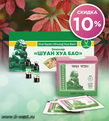 С  1 по 10 октября при покупке концентрата «Фан Фэн» и противовирусного эликсира «Шуан Хуа Бао» — скидка 10 %!